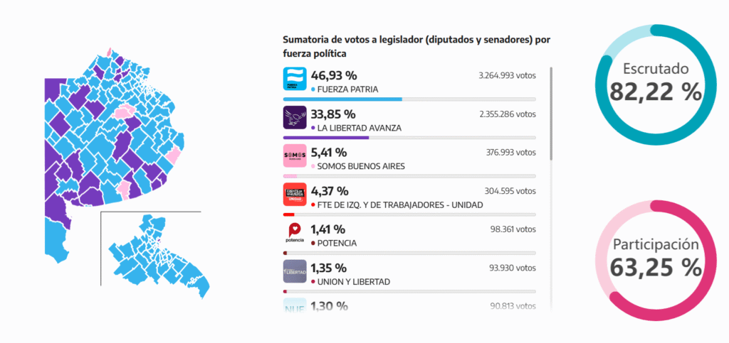 El peronismo se impone claramente en las elecciones bonaerenses con Axel Kicillof a la cabeza. Con el 82% de mesas escrutadas, Fuerza Patria supera por 14 puntos de diferencia a La Libertad Avanza en el Conurbano.