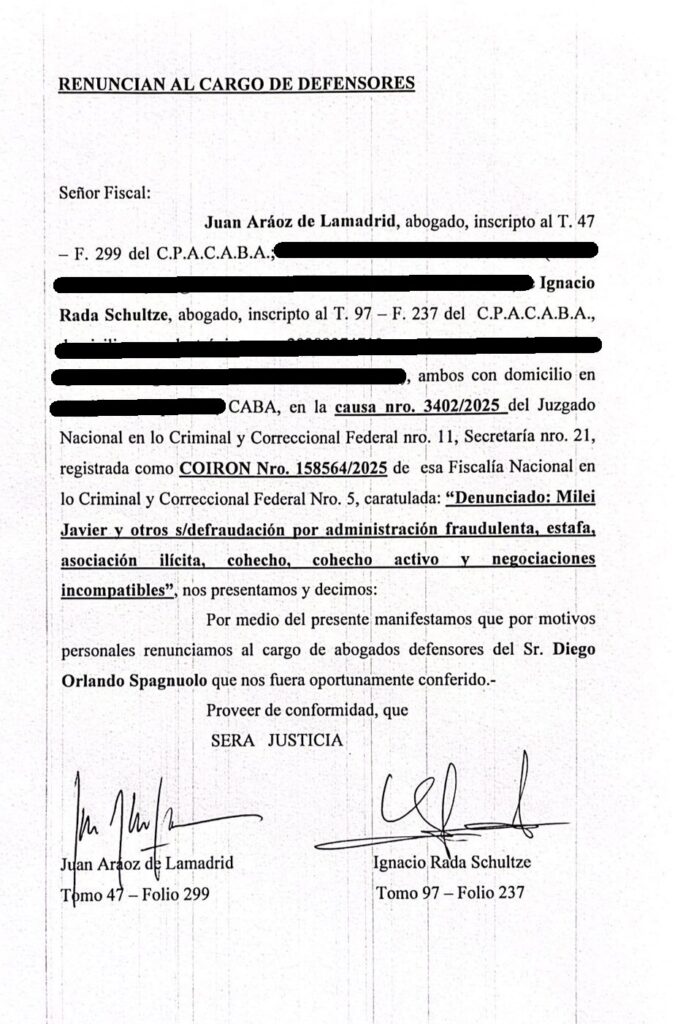Los abogados defensores de Diego Spagnuolo, exdirector de la Agencia Nacional de Discapacidad (ANDIS), renunciaron este viernes mientras avanza la investigación judicial por presuntas coimas vinculadas a la compra de medicamentos para personas con discapacidad.