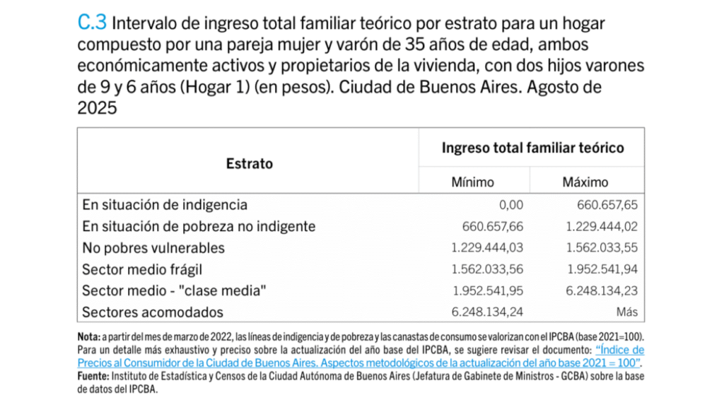Según la Dirección General de Estadística y Censos porteña, el umbral de la pobreza, marcado por la Canasta Básica Total (CBT), se ubicó en $1.229.444 para esta familia. Los hogares con ingresos por debajo de ese monto son considerados pobres. A su vez, la línea de indigencia, que se define por el valor de la Canasta Básica Alimentaria (CBA), fue de $660.658.