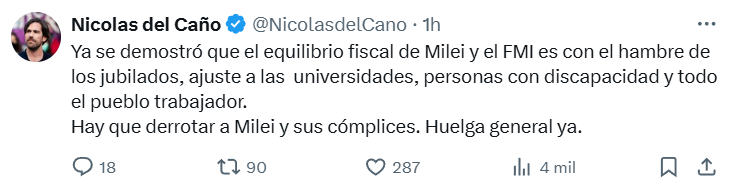Las repercusiones políticas fueron inmediatas y polarizadas. Desde sectores de izquierda, como el Frente de Izquierda, Nicolás del Caño vinculó el plan a un ajuste que afectaría a trabajadores y sectores vulnerables, y llamó a una “huelga general” para rechazar las medidas.