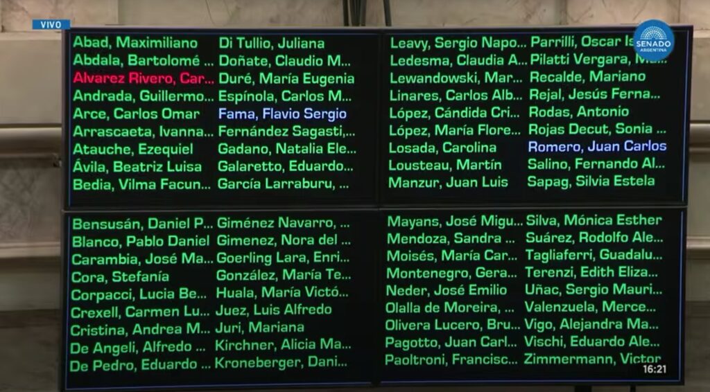 La única senadora que votó en contra fue Carmen Álvarez Rivero, mientras que dos legisladores se ausentaron. La ley fue impulsada por Gabriela Covelli, madre de Nicolás Deanna, junto con legisladores como Fabio Quetlas y recibió amplio respaldo multipartidario.