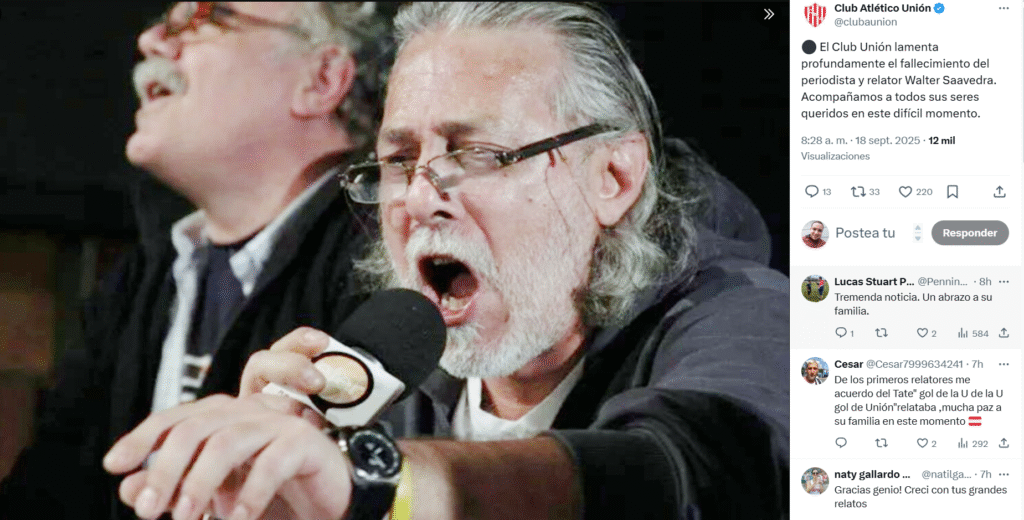 Walter Saavedra, reconocido relator y periodista deportivo argentino, murió a los 68 años después de semanas internado en Buenos Aires. Fue un referente del relato futbolístico por su estilo único y sensible que marcó varias generaciones.
