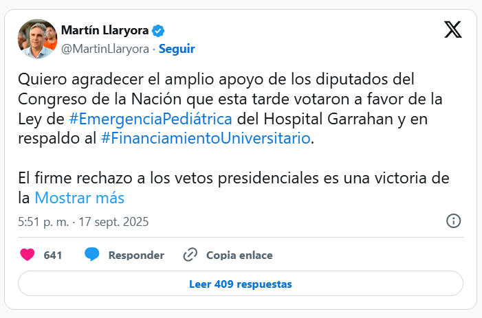 El gobernador de Córdoba, Martín Llaryora, celebró el rechazo de los vetos presidenciales a las leyes de financiamiento universitario y el Hospital Garrahan. El mandatario calificó la decisión como una “victoria de la democracia”, y criticó al gobierno por darle la espalda al pueblo.