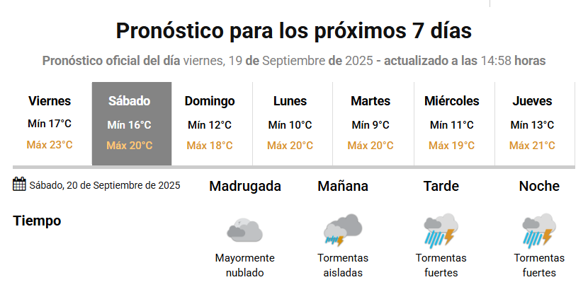 Se espera que las tormentas sean puntualmente fuertes y, en algunas zonas, se repitan episodios de granizo. El viento se mantendrá presente y se prevén ráfagas que podrían causar situaciones de riesgo en áreas urbanas. Para el domingo se anticipan más períodos secos, aunque con nubosidad y eventuales chaparrones aislados.
