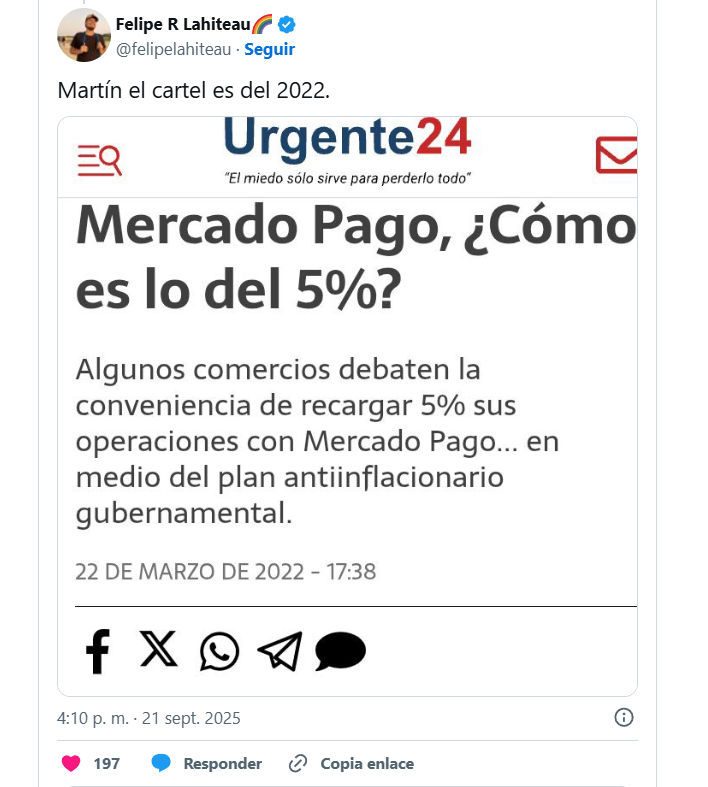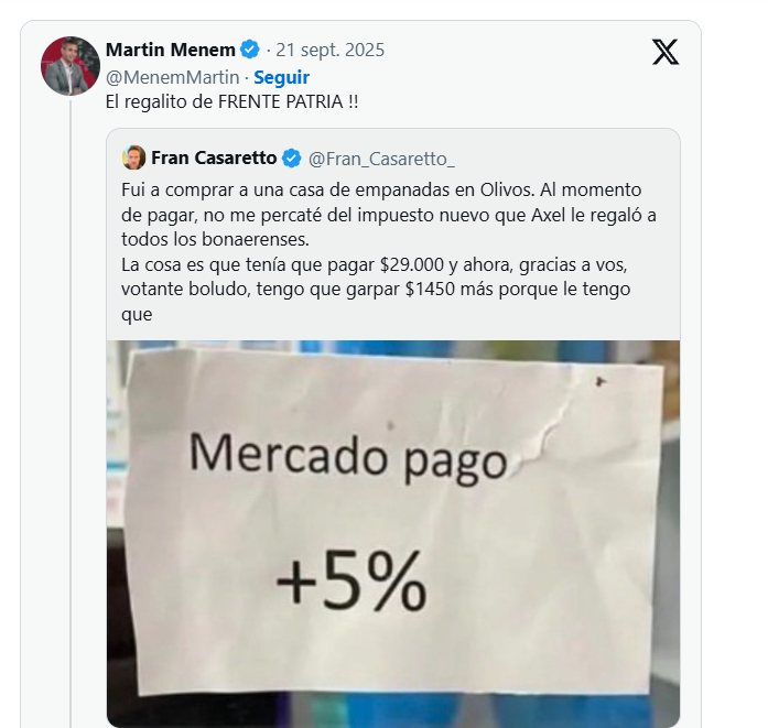 El incidente se inició cuando Menem reposteó un tuit de un influencer libertario, Fran Casaretto, en el que se mostraba un cartel de un local de empanadas que anunciaba un recargo por pagar con Mercado Pago. La intención del post era adjudicarle a Kicillof la creación de un nuevo impuesto, con el mensaje “El regalito de Fuerza Patria”. Sin embargo, rápidamente, varios usuarios le hicieron ver al presidente de la Cámara de Diputados que se trataba de una imagen de 2022 y que el local en cuestión no era una empanadería, sino una farmacia.