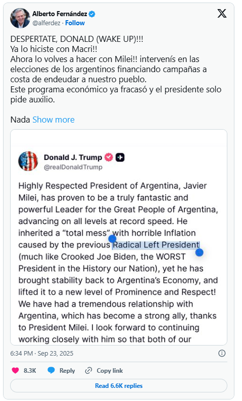 “Despertate, Donald (Wake UP)!!! Ya lo hiciste con Macri!! Ahora lo volves a hacer con Milei!! intervenís en las elecciones de los argentinos financiando campañas a costa de endeudar a nuestro pueblo”, comparó el exmandatario argentino en redes sociales.