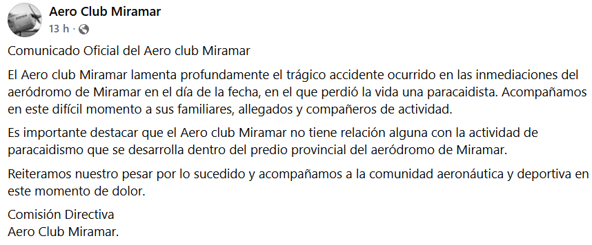 Una mujer de 52 años, identificada como Rosana Mabel Back, murió en Miramar al fallar su paracaídas. La víctima, una paracaidista experimentada, cayó violentamente al césped. La Justicia investiga las causas y el aeroclub se desligó de responsabilidades.