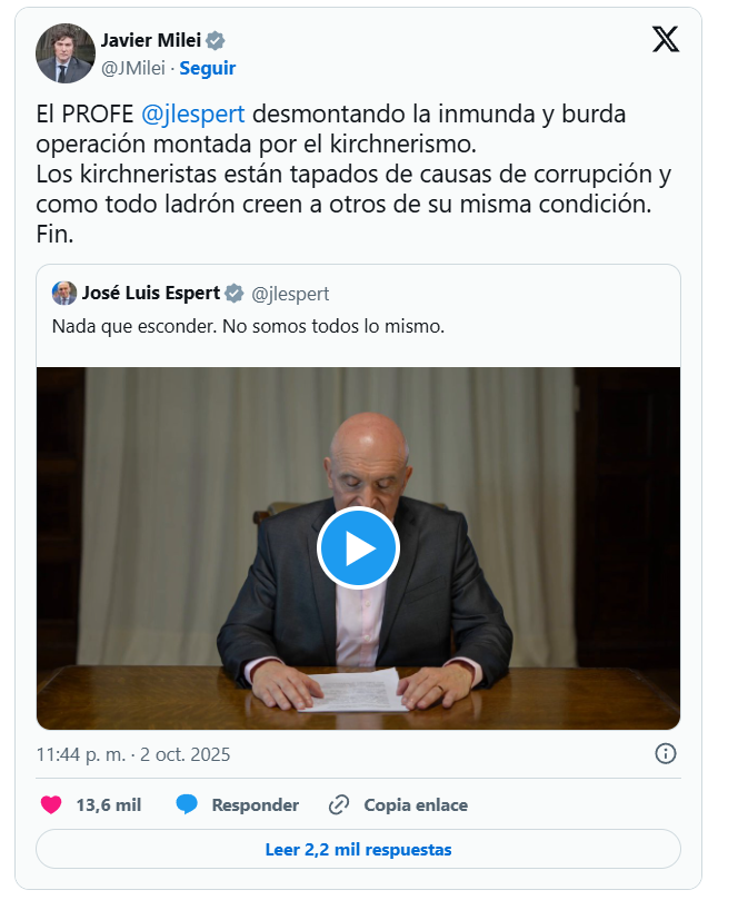 Javier Milei ratificó su apoyo a José Luis Espert, calificando las acusaciones en su contra de “operación inmunda”. El candidato libertario admitió haber recibido u$s200.000 de una empresa vinculada a un presunto narcotraficante, pero negó que fuera para su campaña.