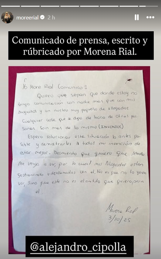 La figura mediática Morena Rial se encuentra actualmente retenida en una unidad penal. Ante la cobertura intensa de su situación, la hija del periodista Jorge Rial decidió emitir una carta de puño y letra dirigida a la opinión pública, confirmando su estado y solicitando expresamente el apoyo de su círculo cercano.