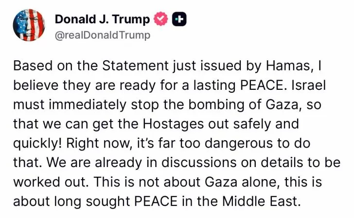 El presidente de Estados Unidos, Donald Trump, se pronunció este viernes en su red social Truth Social tras el anuncio de Hamás de aceptar liberar a todos los rehenes que aún mantiene, cifra estimada en 48 personas —de las cuales se cree que unas 20 están con vida—.