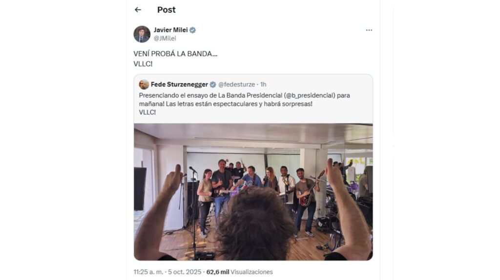 Al respecto, Sturzenegger que también subirá al escenario para el desarrollo teórico del nuevo libro económico, expresó: “Presenciando el ensayo de La Banda Presidencial (@b_presidencial) para mañana! Las letras están espectaculares y habrá sorpresas! VLLC!”.