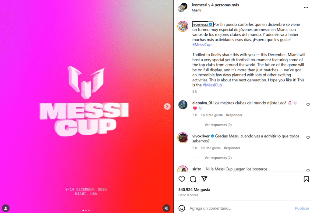 “Por fin puedo contarles que en diciembre se viene un torneo muy especial de jóvenes promesas en Miami, con varios de los mejores clubes del mundo. Y además va a haber muchas más actividades esos días. Espero que les guste”, expresó Lionel Messi en la descripción de su publicación de redes sociales.