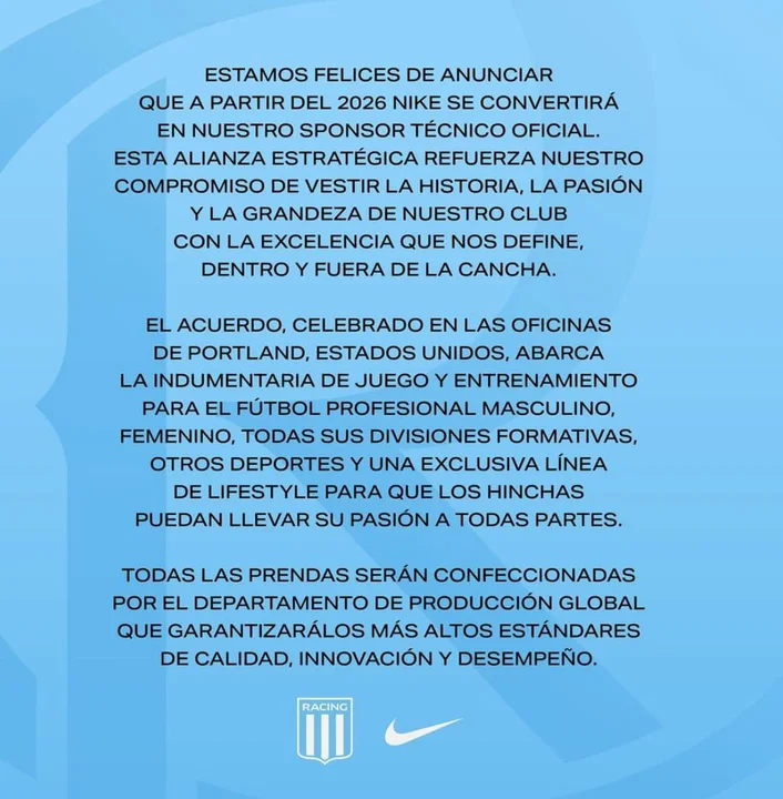 “Estamos felices de anunciar que a partir del 2026 Nike se convertirá en nuestro sponsor técnico oficial. Esta alianza estratégica refuerza nuestro compromiso de vestir la historia, la pasión y la grandeza de nuestro club con la excelencia que nos define, dentro y fuera de la cancha”, comunicó Racing en sus canales oficiales.