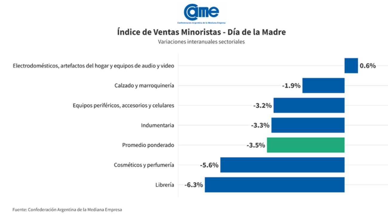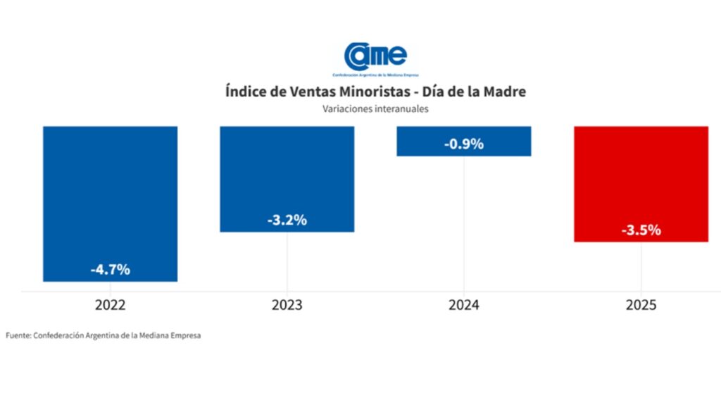 El Día de la Madre 2025 no trajo el alivio esperado al comercio minorista. Según un relevamiento de la Confederación Argentina de la Mediana Empresa (CAME), las ventas en las pymes cayeron un 3,5% frente al mismo período del año anterior, medido a precios constantes.