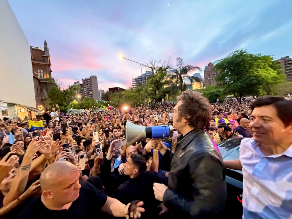 Milei llegó pasadas las 19.20 hs a la intersección de San Lorenzo e Ituzaingó en el centro de Córdoba Capital, donde descendió de una camioneta oficial y se subió al techo para dirigirse a una multitud de militantes que se congregaron para mostrar su apoyo.