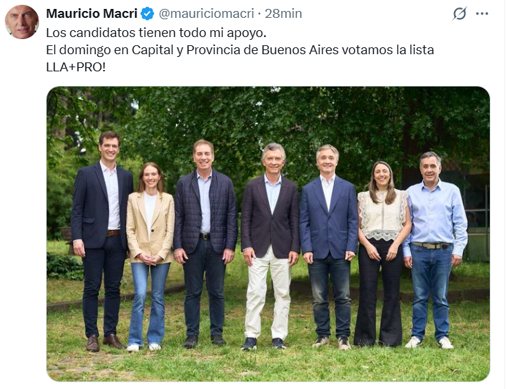 En este sentido, dijo: “Los candidatos tienen todo mi apoyo. El domingo en Capital y Provincia de Buenos Aires votamos la lista LLA+PRO!”. El expresidente resaltó en particular a Fernando de Andreis, quien aunque quedó quinto en la lista porteña encabezada por Alejandro Fargosi (La Libertad Avanza), recibió un respaldo destacado por su trayectoria y compromiso dentro del espacio.