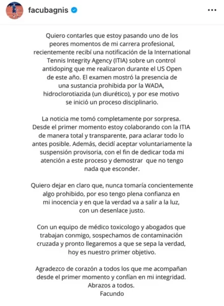 Bagnis, que este año había vuelto a competir tras una lesión de rodilla que casi lo lleva al retiro, insistió en su inocencia y agradeció el apoyo recibido: “Nunca tomaría conscientemente algo prohibido. Tengo plena confianza en que la verdad va a salir a la luz con un desenlace justo”.