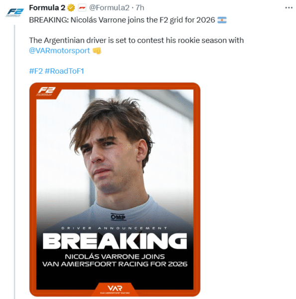 Nicolás Varrone expresó entusiasmo tras la confirmación: “Estoy súper emocionado de unirme a Van Amersfoort Racing para la temporada 2026 de la Fórmula 2. Es un equipo muy profesional con mucha historia y éxito. No puedo esperar para subirme al coche y empezar a trabajar con ellos. Agradezco a todos los que creyeron en mí todos estos años”.​