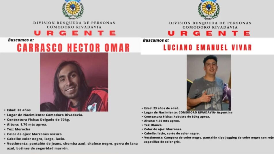Luciano Emanuel Vivar y Héctor Carrasco se encuentran ausentes de Comodoro Rivadavia desde mismo día que los jubilados que fueron vistos por última vez en un paraje.