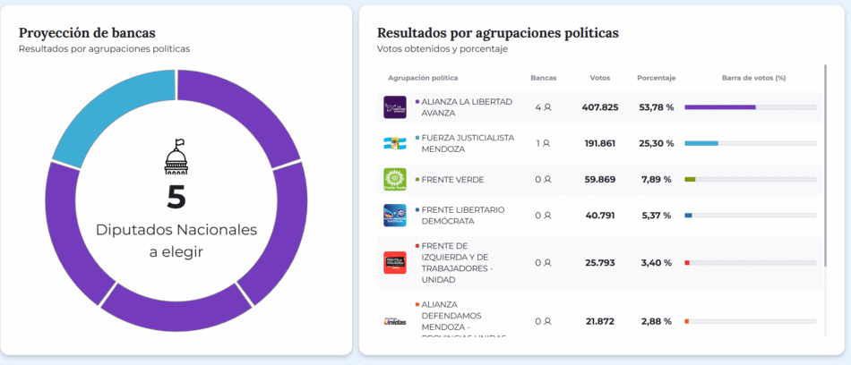 A nivel provincial, el frente Cornejo-Milei también aventajó con holgura en las elecciones de senadores y diputados locales, consolidando la gobernabilidad mediante la aplicación del sistema D’Hondt para el reparto de bancas.