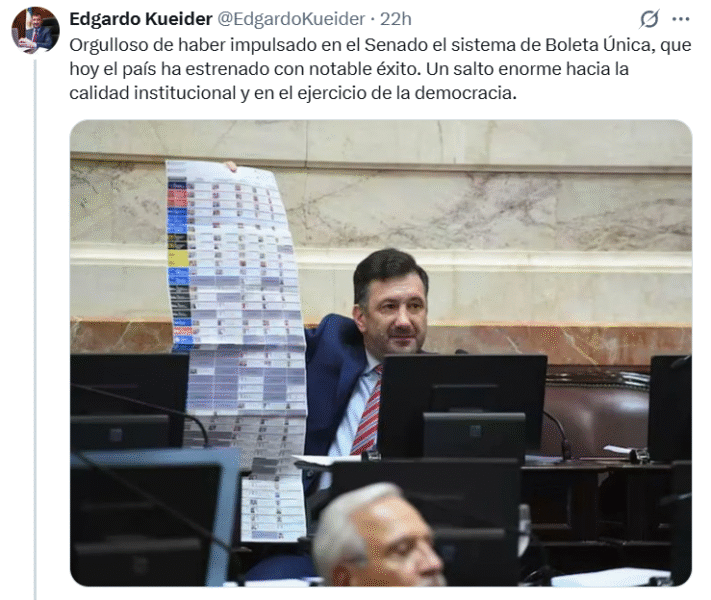Desde su prisión domiciliaria en Asunción, Paraguay, el exsenador nacional por Entre Ríos, Edgardo Kueider, volvió a expresar en sus redes sociales su apoyo a la Boleta Única de Papel (BUP), implementada por primera vez en las elecciones legislativas del 26 de octubre de 2025 en todo el país.