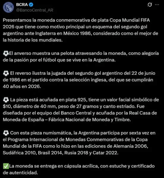 El Banco Central de la República Argentina lanzó una moneda conmemorativa de plata dedicada a la Copa Mundial FIFA 2026.
