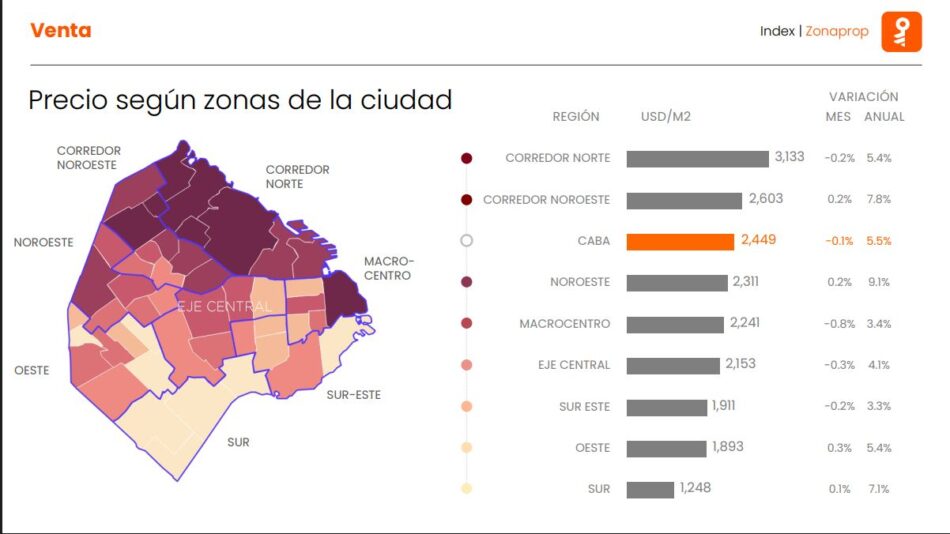Un monoambiente tiene un valor de 107.493 dólares, un departamento de dos ambientes se ubica en 129.366 dólares y uno de tres ambientes cuesta 178.937 dólares. Puerto Madero (6.151 dólares/m2), Palermo (3.398 dólares/m2) y Núñez (3.360 dólares/m2) siguen siendo los barrios con la oferta más cara para departamentos, mientras que Lugano (1.072 dólares/m2) es el más económico.