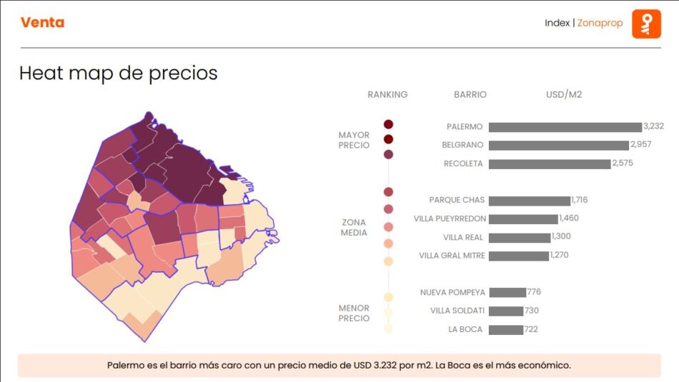 Palermo continúa liderando el ranking de los barrios más caros para la compra de casas, con un precio medio de 3.232 dólares/m2, seguido por Belgrano (2.957 dólares/m2) y Recoleta (2.575 dólares/m2). En el otro extremo, La Boca se posiciona como el barrio más económico, con un precio medio de 722 dólares/m2.