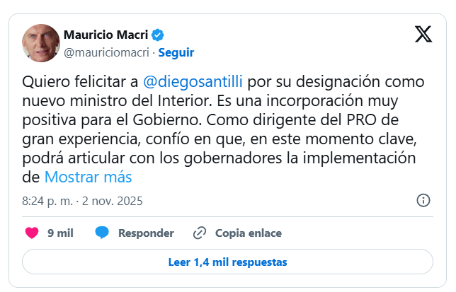 En un breve mensaje publicado en su cuenta de X, Macri destacó la “gran experiencia” de Santilli como dirigente del PRO. El líder del partido amarillo expresó su confianza en que el flamante ministro, en este “momento clave, podrá articular con los gobernadores la implementación de las reformas que necesitamos”.