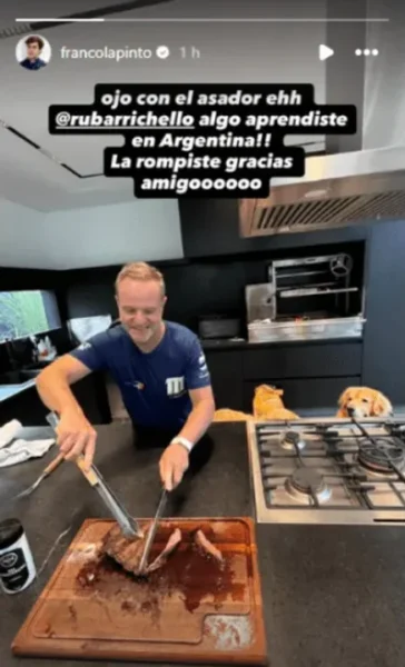Este miércoles, en su día libre, el piloto oriundo del municipio bonaerense de Pilar se mostró comiendo un asado junto al brasileño Rubens Barrichello quien, en 326 carreras, estuvo 68 veces en el podio y alcanzó la victoria en 11 ocasiones, en equipos como Ferrari y Williams.