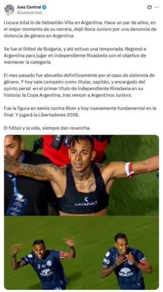 Si bien la cuenta admitió la condena mencionada por la periodista, aseguró que Villa “ya cumplió la condena (en julio 2025)” y que “NO está en libertad condicional en este momento”. Según “Juez Central”, el único caso que le “quedaba pendiente” al jugador era el que “fue recientemente absuelto”.