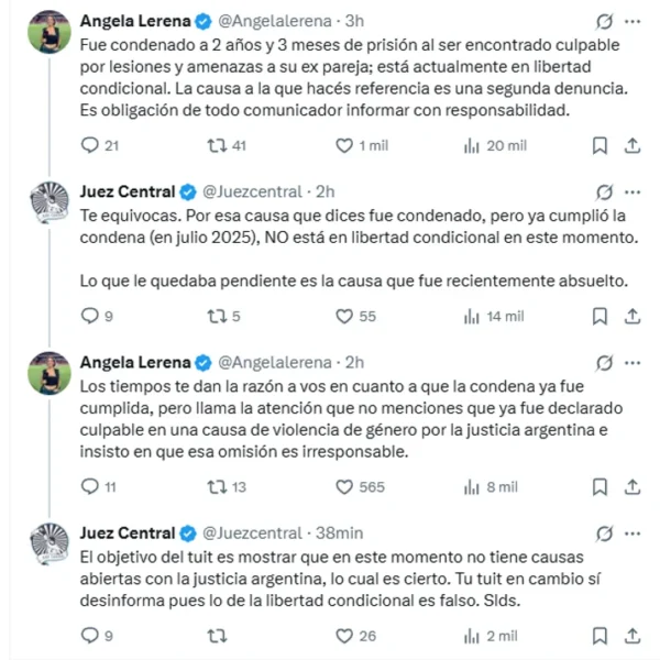 La periodista Angela Lerena salió al cruce para corregir esa información. “Fue condenado a 2 años y 3 meses de prisión al ser encontrado culpable por lesiones y amenazas a su ex pareja; está actualmente en libertad condicional“, escribió Lerena.
