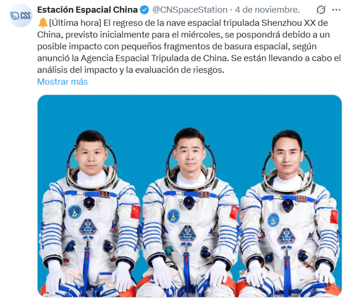 Tres astronautas de la misión Shenzhou-20 permanecen en órbita tras un posible daño sufrido por residuos espaciales que pospuso su regreso desde la estación Tiangong. La Agencia Espacial China evalúa riesgos y aún no anuncia nueva fecha de retorno.