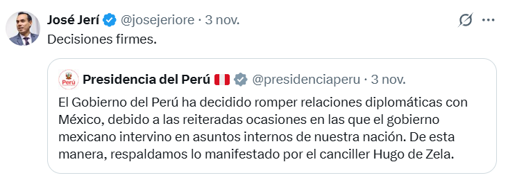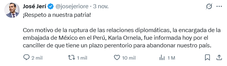 El Congreso de Perú aprobó una moción que declara persona non grata a la presidenta de México, Claudia Sheinbaum, debido a su “inaceptable injerencia en los asuntos internos del Perú”, por la concesión de asilo político a la ex primera ministra Betssy Chávez, procesada por su participación en un intento de golpe de Estado.