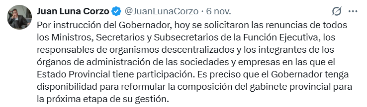 El gobernador de La Rioja, Ricardo Quintela, solicitó la renuncia de todos los miembros de su gabinete, incluyendo ministros, secretarios, subsecretarios y titulares de organismos descentralizados. La decisión se produjo luego de su estrecho triunfo en las elecciones legislativas del 26 de octubre, donde ganó por poco más de 700 votos.