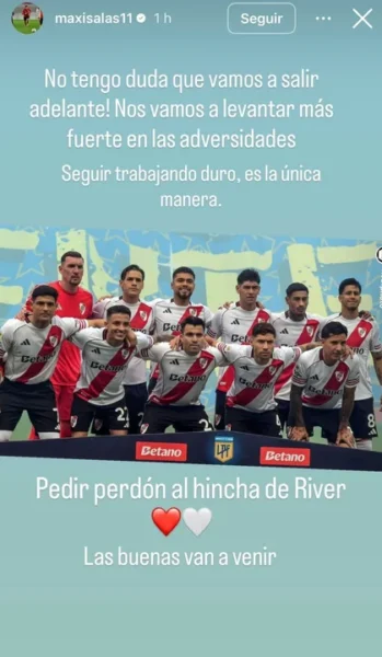 En medio de la desazón y las críticas, el delantero decidió hablar directamente con los fanáticos de la institución de Núñez a través de sus redes sociales: “¡No tengo dudas de que vamos a salir adelante! Nos vamos a levantar más fuertes en las adversidades. Seguir trabajando duro, es la única manera. Pedir perdón al hincha de River, las buenas van a venir”.