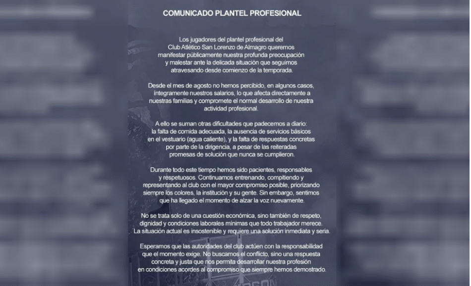Los jugadores de San Lorenzo realizaron un fuerte comunicado en el que expresaron su “preocupación y malestar” y subrayaron que “llegó el momento de alzar la voz”.