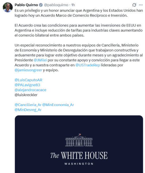 Quirno, quien asistió a la firma en Washington y fue recibido por el secretario de Estado estadounidense, Marco Rubio, calificó la firma como “un privilegio y un honor” y reconoció el trabajo conjunto de los equipos de Cancillería, Economía y Desregulación. Asimismo, expresó su agradecimiento al presidente Javier Milei por su “constante apoyo y convicción” para concretar el acuerdo.