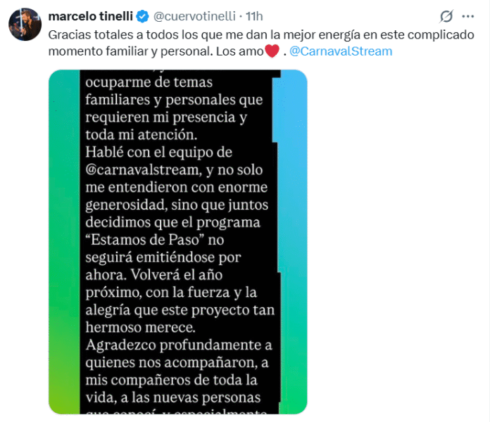 Según informó el equipo de Carnaval Stream, plataforma que emitía el programa, se acordó levantar la transmisión para garantizar un tiempo de reflexión y restablecimiento. La pausa no implica una cancelación definitiva, ya que Tinelli manifestó su intención de retomar la conducción en 2026 con energías renovadas.