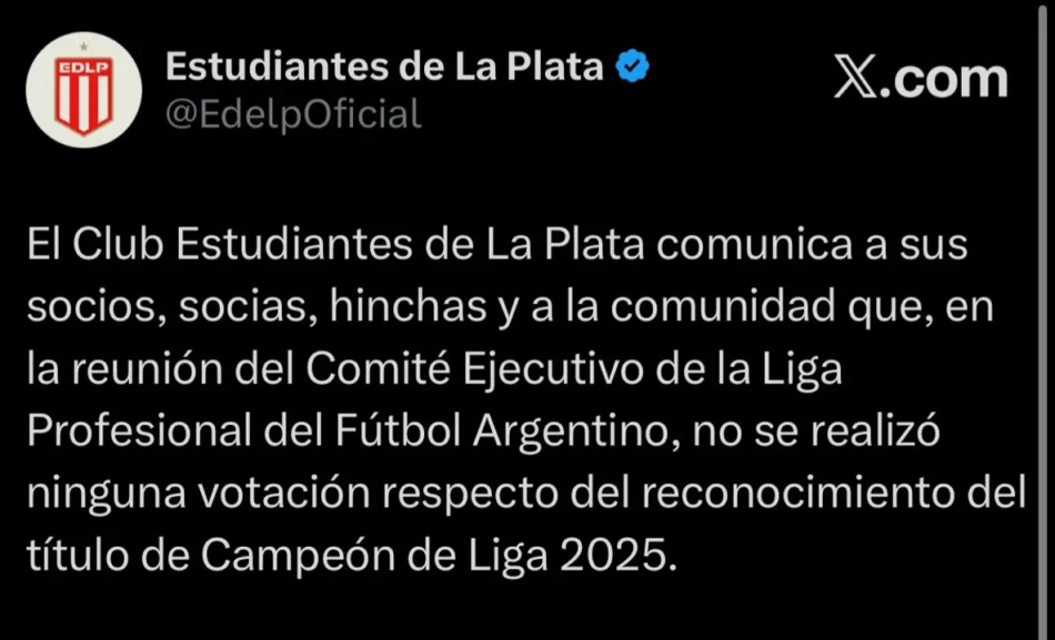 Estudiantes de La Plata aclaró que en la reunión del Comité Ejecutivo de la Liga Profesional no se sometió a votación ningún reconocimiento sobre el título de Campeón de Liga 2025.