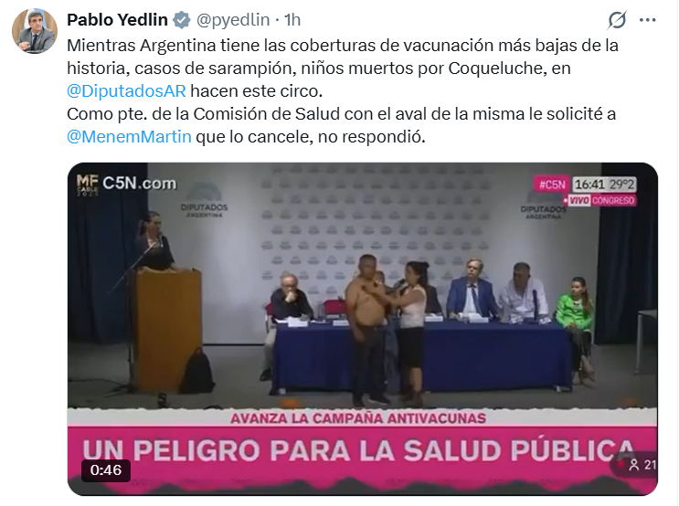 Pablo Yedlin calificó el evento como un “circo” debido a la simultaneidad con la crisis sanitaria en el país, con casos de sarampión y muertes por coqueluche.