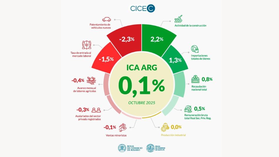 La economía argentina dio una tímida pero significativa señal de reactivación en octubre. Según el último informe del Indicador Compuesto de Actividad Económica Argentina (ICA-ARG), elaborado conjuntamente por la Bolsa de Comercio de Rosario y la Bolsa de Comercio de Santa Fe, la actividad registró un incremento mensual del 0,1%.