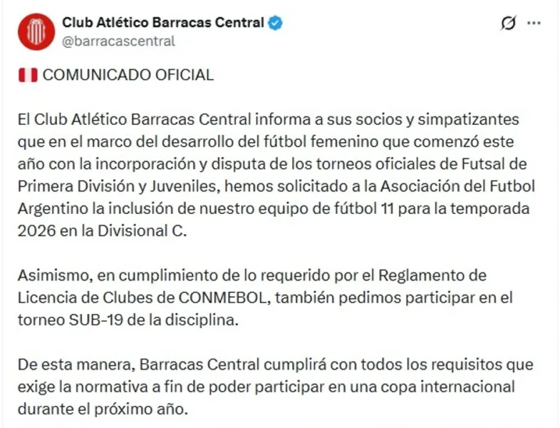 Ante esto, Barracas Central emitió un comunicado este lunes comunicandole a sus socias y socias que “en el marco del desarrollo del fútbol femenino que comenzó este año con la incorporación y disputa de los torneos oficiales de Futsal de Primera División y Juveniles, hemos solicitado a la Asociación del Futbol Argentino la inclusión de nuestro equipo de fútbol 11 para la temporada 2026 en la Divisional C”.