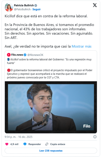 Patricia Bullrich y Axel Kicillof se enfrentaron por la reforma laboral, cruzando críticas sobre la informalidad y la justicia social. Mientras el oficialismo busca dictaminar este viernes, gobernadores peronistas denuncian que los cambios legales profundizarán el desfinanciamiento de las arcas provinciales.