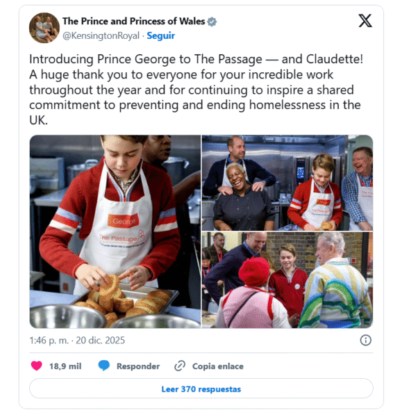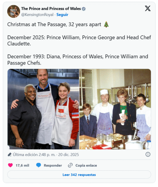 En un gesto cargado de simbolismo, el heredero a la Corona británica asistió junto a su hijo mayor a la sede de la fundación The Passage en Londres. El objetivo de la visita fue colaborar en la elaboración del banquete navideño para ciudadanos en situación de calle, repitiendo una vivencia que el propio Guillermo experimentó hace tres décadas de la mano de su madre, la princesa Diana.