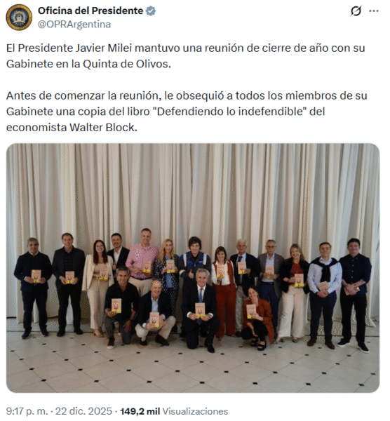 Antes de iniciar la cena, el jefe de Estado obsequió a cada ministro un ejemplar del libro Defendiendo lo indefendible, del economista Walter Block. El gesto simbólico buscó reforzar la cohesión ideológica del equipo en un momento donde el Ejecutivo enfrenta el reto de aprobar el Presupuesto 2026 en el Senado, sesión que fue formalizada para este viernes al mediodía.