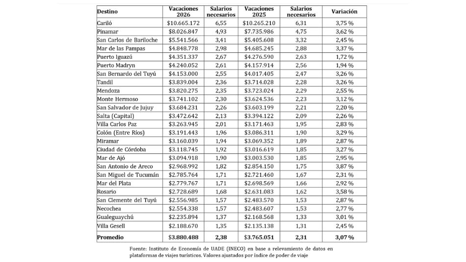 El informe detalla que “una familia tipo debe disponer de $3.880.488, en promedio, para irse de vacaciones en la segunda quincena de enero”. Esta cifra, que contempla traslados y alojamiento para cuatro personas, representa un desafío significativo: “Este importe equivale a 2,38 sueldos promedio medidos por RIPTE”.