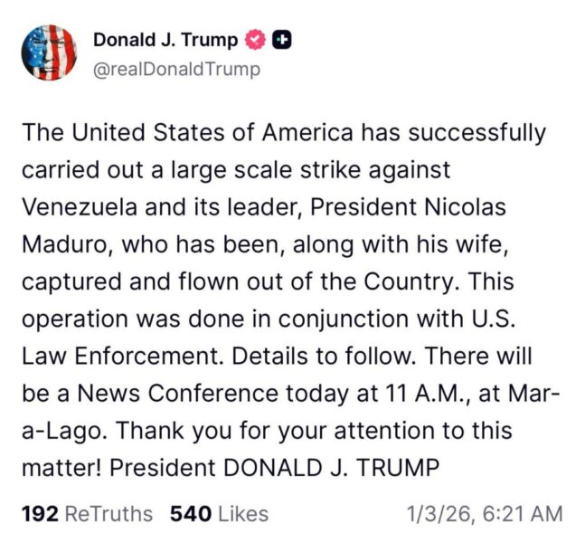 Donald Trump aseguró en su red social, Truth Social, que la operación resultó exitosa y que trasladaron a los detenidos fuera del territorio venezolano. El líder republicano calificó la incursión como una maniobra a gran escala realizada en conjunto con las fuerzas del orden. Asimismo, programó una rueda de prensa a las 11:00 horas desde Mar-a-Lago para ofrecer mayores detalles.