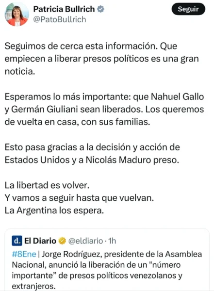 “Seguimos de cerca esta información. Que empiecen a liberar presos políticos es una gran noticia. Esperamos lo más importante: que Nahuel Gallo y Germán Giuliani sean liberados. Los queremos de vuelta en casa, con sus familias”, sostuvo la ex ministra de Seguridad en su cuenta de X.