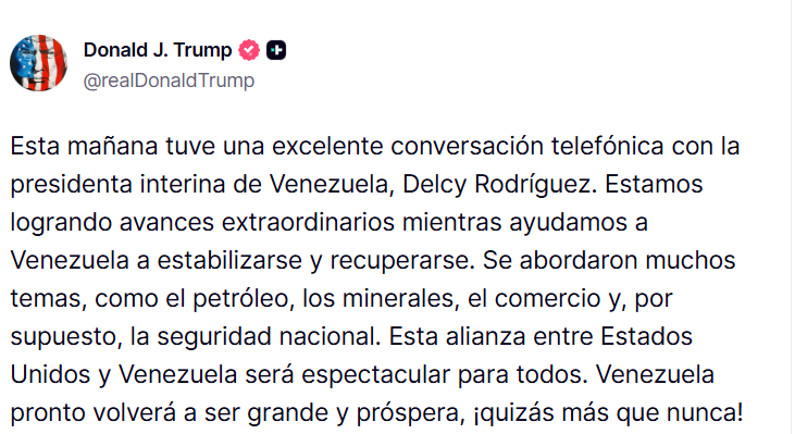Según Trump, la conversación se centró en temas de seguridad nacional, comercio y el flujo de recursos energéticos. El mandatario destacó que su administración ya coordina la recepción de crudo venezolano como parte de los acuerdos de estabilización.